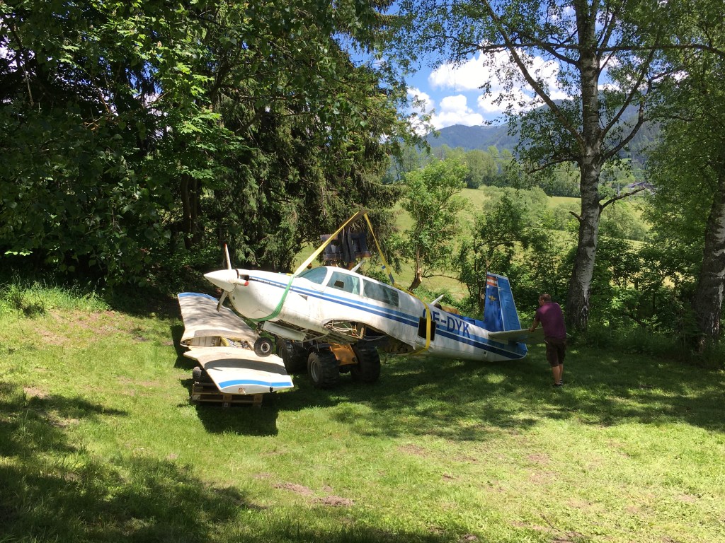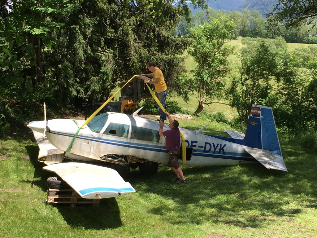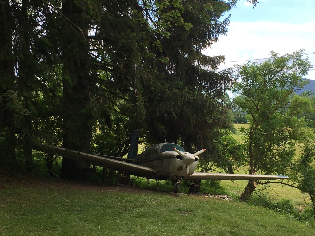 Ein Kurzbesuch im Internetz sorgt schnell für Aufklärung. Ein Flugzeug! Na klar. Al Mooney war wohl der Flugzeugkonstrukteur der texanischen Ölbarone, seine Flugzeuge in besseren Kreisen recht verbreitet in den 60er und 70er Jahren. Auf Nachfrage folgt dann die ganze Geschichte. Die besagte Mooney M20 hat drei Notlandungen hinter sich, seit der letzten ist die Fluglizenz weg. Das Ding muss auf dem Boden bleiben. Das war vor Jahrzehnten und seither steht sie auf dem Privatgrundstück des Besitzers. Dort muss sie weg und weil man während Corona ja auch was Sinnvolles tun sollte, hat er sie gekauft. Als Spielgerüst und Blickfang für den eigenen Garten.
