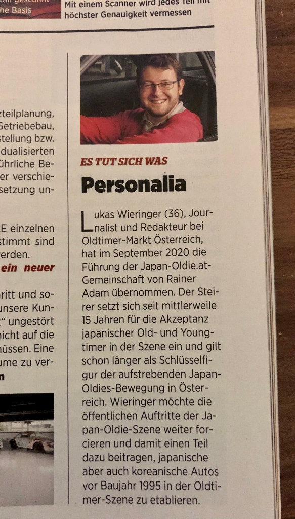 Lasst mich ein wenig ausholen: In der heurigen Jänner-Nummer der Oldtimer Markt Österreich ist in der Rubrik „Was uns bewegt – Szenethemen“ ein kleines Kasterl erschienen. In dem wurde ich als neuer Kopf der Japan-Oldies.at-Bewegung vorgestellt.