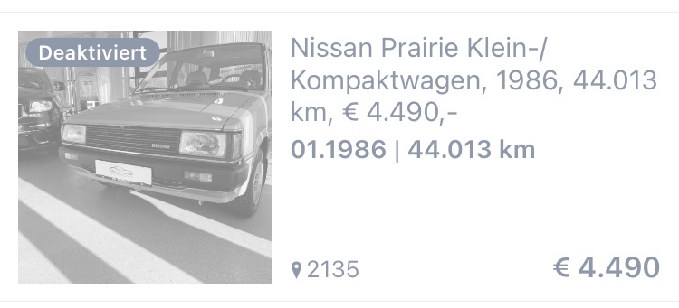 Dass ich am Nissan Prairie einen Narren gefressen habe, ist ja hinlänglich bekannt. Hab ich doch sogar ein Buch über das Ding geschrieben. Und als Anfang Jänner ein 85er Prairie 1.5 GL mit 44.013km aus erster Hand auftaucht, muss ich mir das Ding natürlich anschauen. Wahrscheinlich bekomme ich nie wieder die Gelegenheit, ein Exemplar mit so niedriger Laufleistung zu sehen. Also auf ins Weinviertel. Ganz nach oben, an die Tschechische Grenze. Zweieinhalb Stunden Fahrt in eine Richtung.