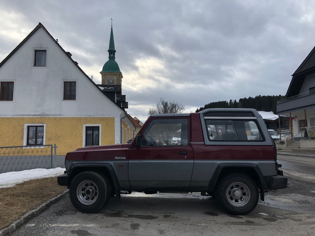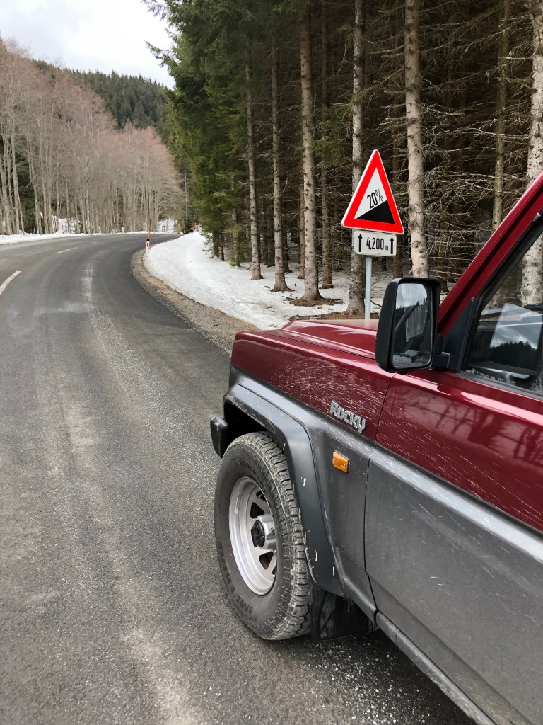 Bevor er mich aber verlässt, machen wir noch einen gemeinsamen Ausflug in die Gegend meiner Jugend. Dort hin, wo die Landstraßen kurvig und hügelig und die Durchschnittstempi niedrig sind. Ideal. Und wirklich – Sobald die S6 hinter ihm liegt, wird der Rocky lebendig. Verwandelt sich von der dröhnig-mühsamen Hoppelkiste in einen typischen japanischen Geländewagen der 80er Jahre. Sämiger Motor, exaktes Getriebe, souveräner Durchzug. Unglaublich, wie stark die Umgebung den Eindruck, den ein Auto auf den Fahrer macht, verändern kann.
