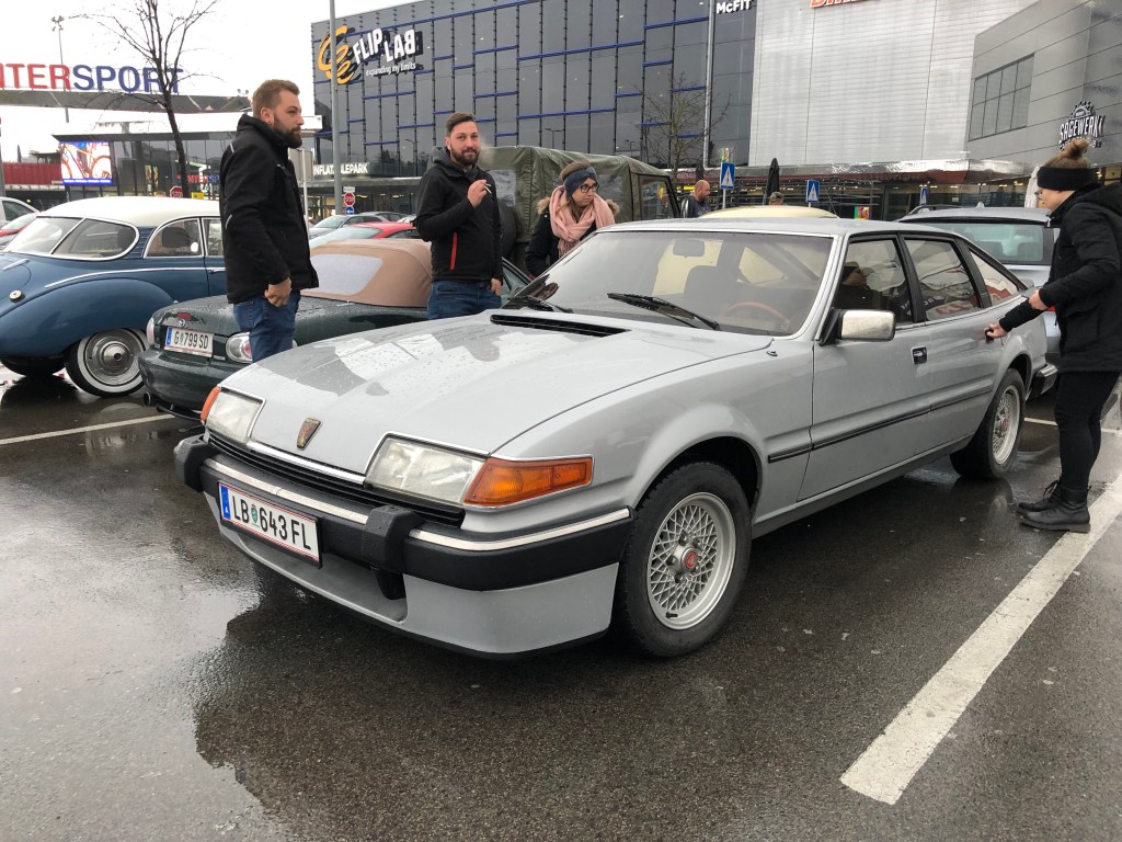 Seit heuer findet das Alltagsklassiker Saturday Night Treffen im Center West statt, der Citypark ist offenbar Geschichte. Das ändert auch meine Taktik ein wenig. Im Center West lohnt es sich nicht, vor 18Uhr zu erscheinen, da der Parkplatz dann noch voll ist mit Convenience-Shoppern. So nennt man das heute. Erst gegen 18:30Uhr beginnt sich der Parkplatz zu leeren. Die Gefahr, von genervten Familienvätern und überforderten Pensionisten beim Rangieren zusammengeführt zu werden, sinkt. Und damit steigt die Möglichkeit, mit Gleichgesinnten gefahrlos Herumstehen zu können. Mit kalten Zehen. Im Schneeregen.