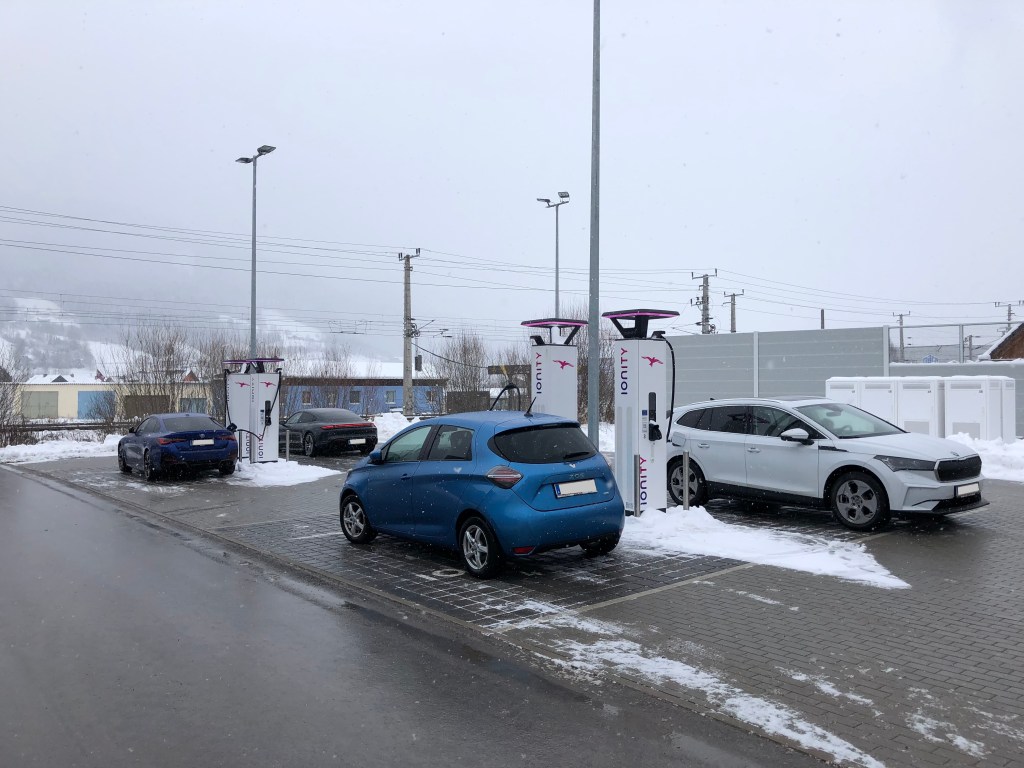 Klingt alles total entspannt. Schließlich gibts neben dem Ladepark nicht nur eine WC-Anlage, sondern auch einen großen Spar-Markt, der zum Jausnen einlädt. Ideal um 10 Uhr Vormittags. Bloß kommt da schon wieder der Winter ins Spiel… Mit kaltem Akku dauert die Ladepause knapp 45 Minuten. Sooo interessant ist der Spar auch nicht. Nach einer halben Stunde hat man die Jause gekauft und die hölzerne Deckenkonstruktion bewundert. Auch war mir nicht bewusst, wie verdächtig das auf Supermarkt-Mitarbeiter wirkt, wenn man in den Gängen einfach nur herumsteht und genauso ausgiebig wie wahllos Inhaltsangaben liest. Aber besser drinnen im geheizten Geschäft warten als draußen am kalten und verschneiten Parkplatz.
