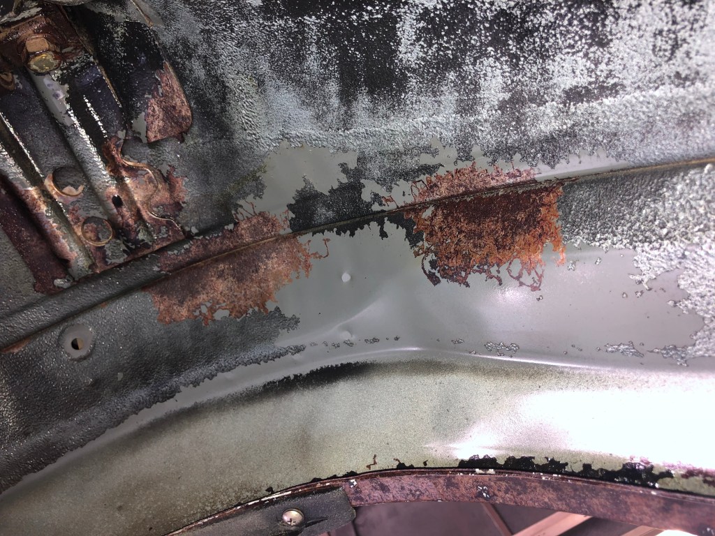 Der Rostumwandler kann jetzt seine Arbeit tun. Danach wird lackiert und konserviert. An manchen Stellen auch geschweißt. Klar, auch so manches Locherl ist aufgetaucht. Aber im Verborgenen bleibt nach dem Strahlen gar nichts mehr.