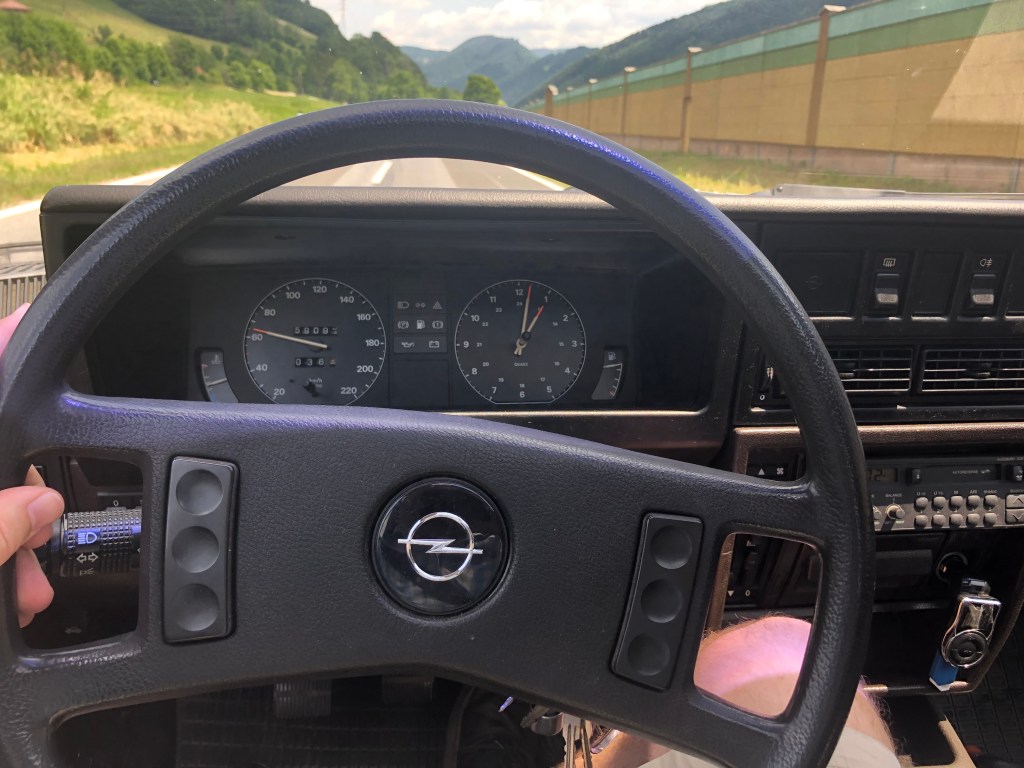 Gleich beim Motorstart fällt auf, dass doch nicht alles so vergleichbar ist wie gedacht. Mein Tausch-Objekt ist der letzte (!) in Österreich zugelassene Rekord Turbo-Diesel mit Pickerl, der fährt. Und aus seiner Spritsorte macht er auch kein Geheimnis. Der bleischwere Guss-Block mit Guss-Kopf (!) und Turbo klingt im Stand wie ein Schiffsdiesel. RaRaRaRa. Die Kupplung fordert ein strammes Wadl und das stehende Gaspedal einen entschlossenen Tritt, dann setzt er sich in Bewegung. Und das nicht einmal schlecht. Es dauert zwei bis drei Gedenksekunden, aber wenn der Ladedruck dann eintrifft, gehts ordentlich vorwärts. Bei etwas höheren Drehzahlen wird er richtig munter. Untertourig mag er nicht so.