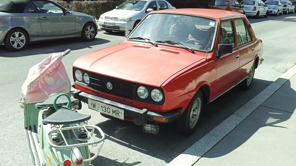 Heute, 34 Jahre nach dem Auslaufen der schwarzen Kennzeichen, ist selbst ein Weißes ohne EU-Balken und mit vergilbtem Wien-Wappen schon spannend. Erst recht, wenn es auf einem Heckmotor-Skoda montiert ist und davor der Roller der Gattin parkt. Nachhaltige Mobilität kann so cool aussehen.