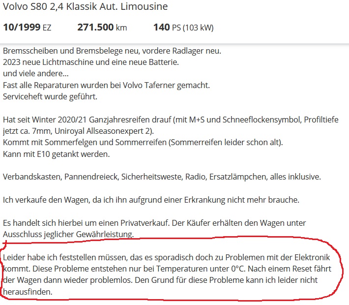 Das sind nur zwei von unzähligen Beispielen für inserierte S80 der letzten Jahre, die mit Elektronikproblemen oder mysteriösen Startversagern gestrandet sind und von ihren verzweifelten Besitzern verkauft werden.