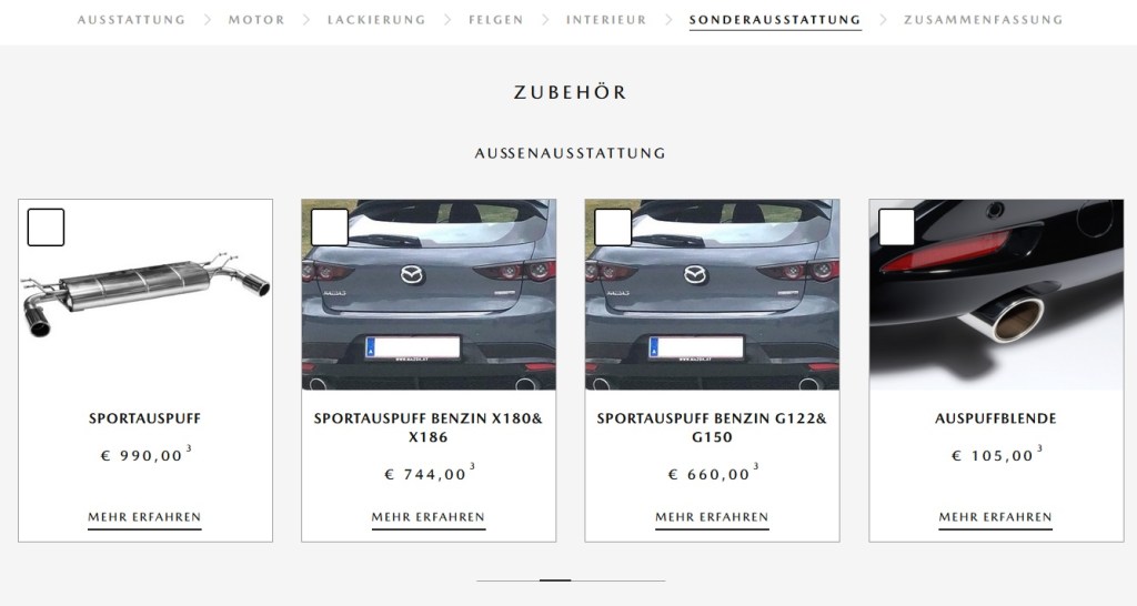 Den Vogel schießt der Mazda-Konfigurator aber ab, wenn man es bis zum Menüpunkt „Sonderausstattung“ geschafft hat. Gibt´s da doch etwa beim eleganten, aber recht braven Kompakt-SUV CX-30 gleich vier verschiedene Sportauspuffe bzw. Auspuffblenden. Neben Frontschürzen, Seitenschwellern, Dekor-Aufkleber oder Spiegelkappen in verschiedenen Farben. Sehr Oldschool, all das. In Zeiten, in denen sichtbare Auspuffendrohre von dauer-empörten Hysterikern schon als Provokation empfunden werden und in denen Plastikblenden richtige Endrohre verdecken sollen.