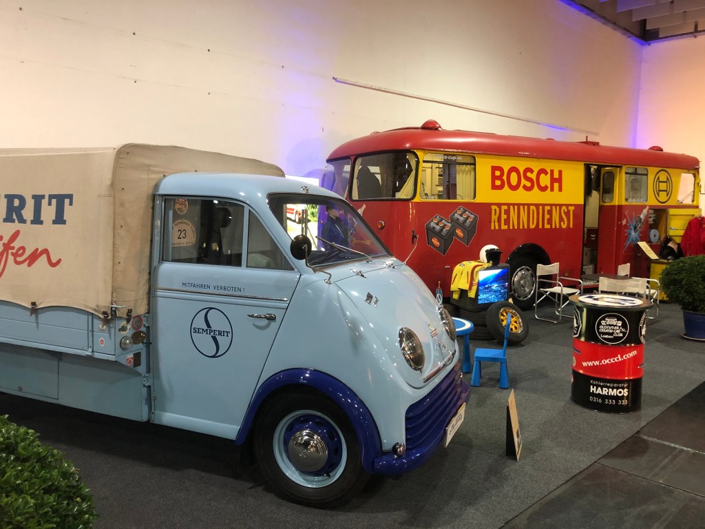 Nur in der kleinen Halle C, neben E-Bikes auch mit Ständen des Joanneum Research (selbstfahrende Autos), der TU Graz oder der Virtual Vehicle Research GmbH bestückt, kommt einfach keine Stimmung auf. Selbst mein 8 Jahre alter Begleiter stellt schnell fest „Das moderne Zeugs ist fad, die Halle mit den Oldtimern ist viel cooler.“ Also doch alles richtig gemacht!
