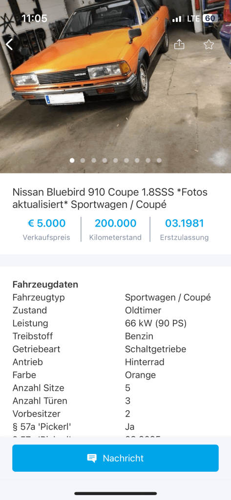 Dass der Verkäufer auch noch Lackierer und Mechaniker ist, überrascht da umso mehr. Seine Ehrlichkeit, das Ding erst vor 2 Monaten für einen kleinen vierstelligen Betrag geschossen zu haben, weil er einfach nur einen billigen Hecktriebler für den Winter gesucht hat, auch. Jetzt fährt er wieder BMW und überlegt sich, den Bluebird SSS „in der Szene“ zu verkaufen. Der wird sich anschauen…