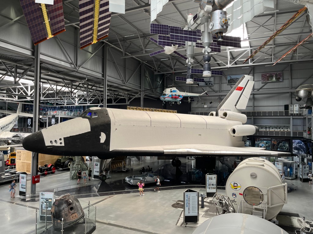Die nächste Halle hat da deutlich mehr roten Faden. In der dreht sich alles um die „Buran“, die einzige für einen Orbitalflug eingesetzte Raumfähre aus dem gleichnamigen Raumfähren-Projekt der Sowiets. Wie die da in die Halle gekommen ist… Keine Ahnung. Daneben noch viel anderes außerirdisches. Spannend, wenn auch wirklich viel. Viele Uniformen, viele Infotafeln, viele Namen. Für Fans von Astronauten und deren Missionen wohl der siebente Himmel.