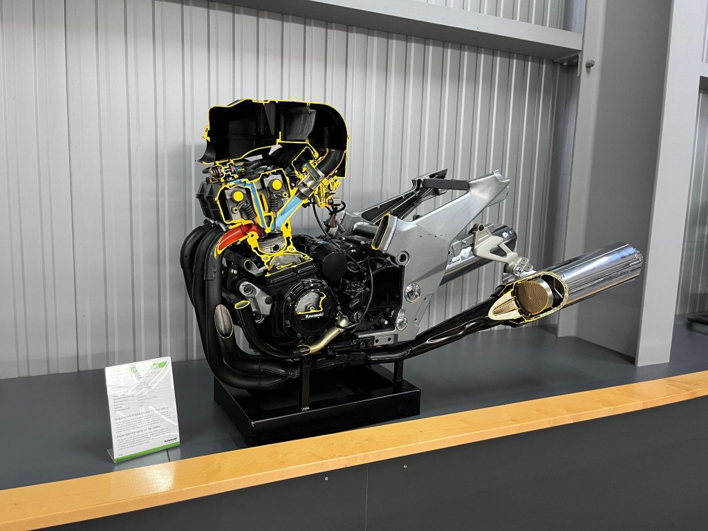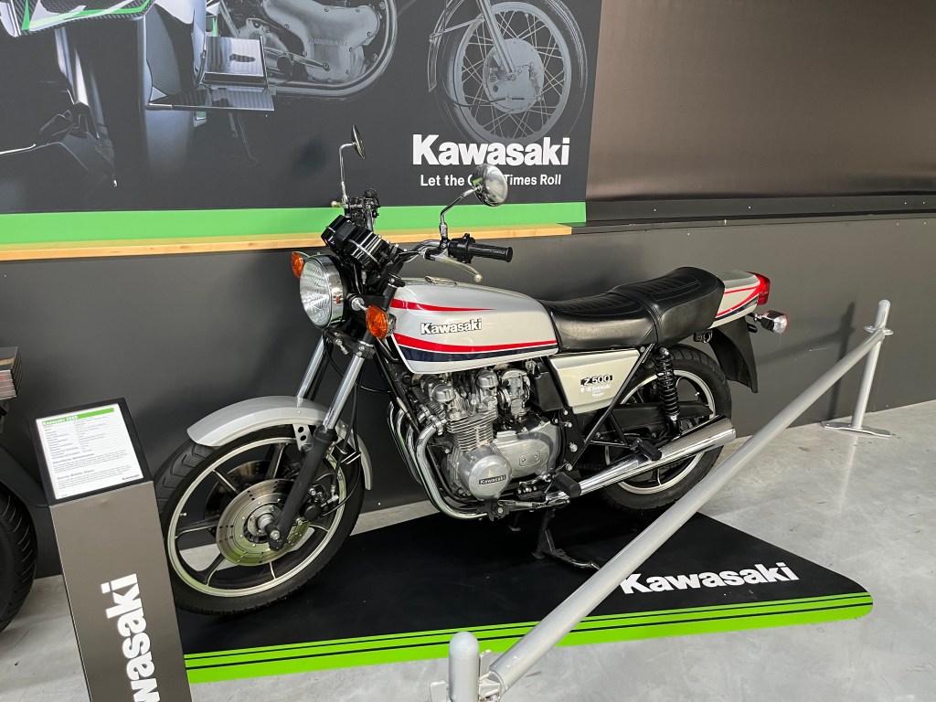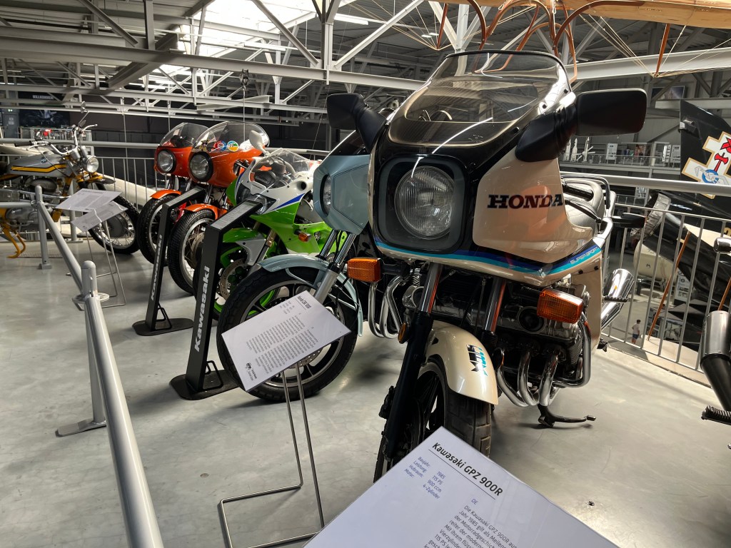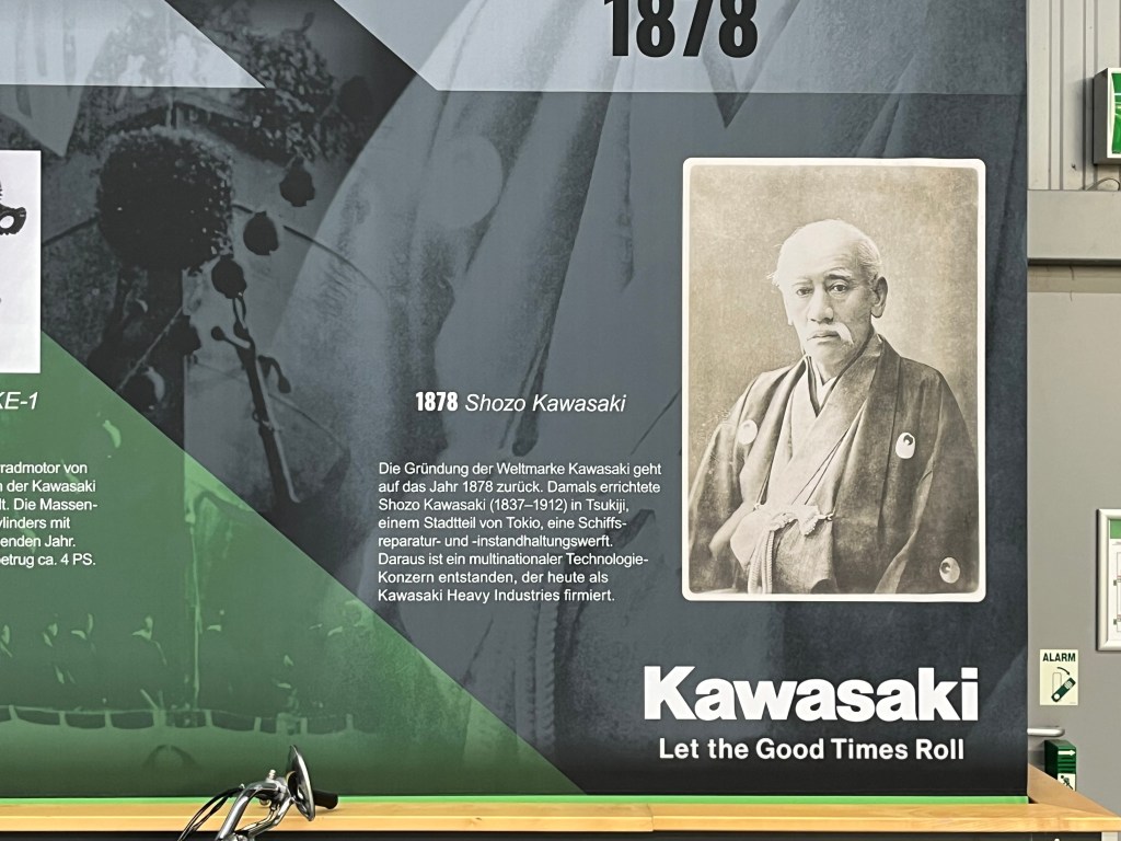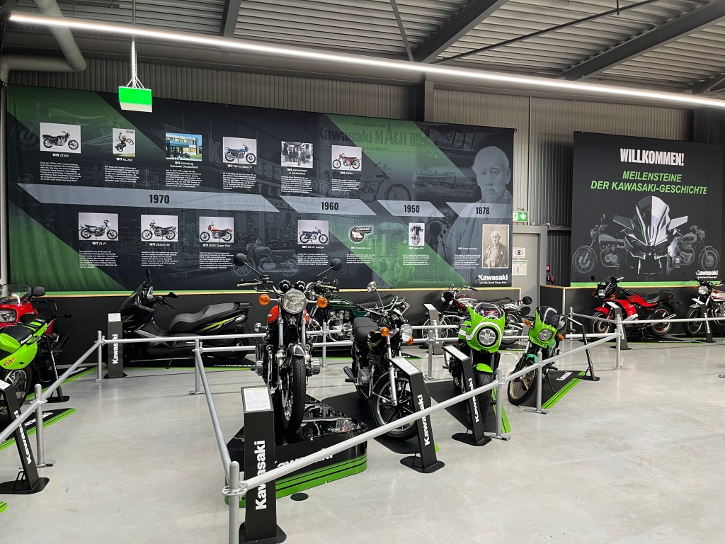 Und dann plötzlich das… Eine Kawasaki-Sonderausstellung. Das muss gesponsert sein. Mehrspurig Japanisches gibts gar nicht, als würden sie nicht existieren. Doch in Sachen Einspurigkeit haben japanische Hersteller offenbar eine Berechtigung. Daneben stehen Hondas, Yamahas, man glaubt es kaum.